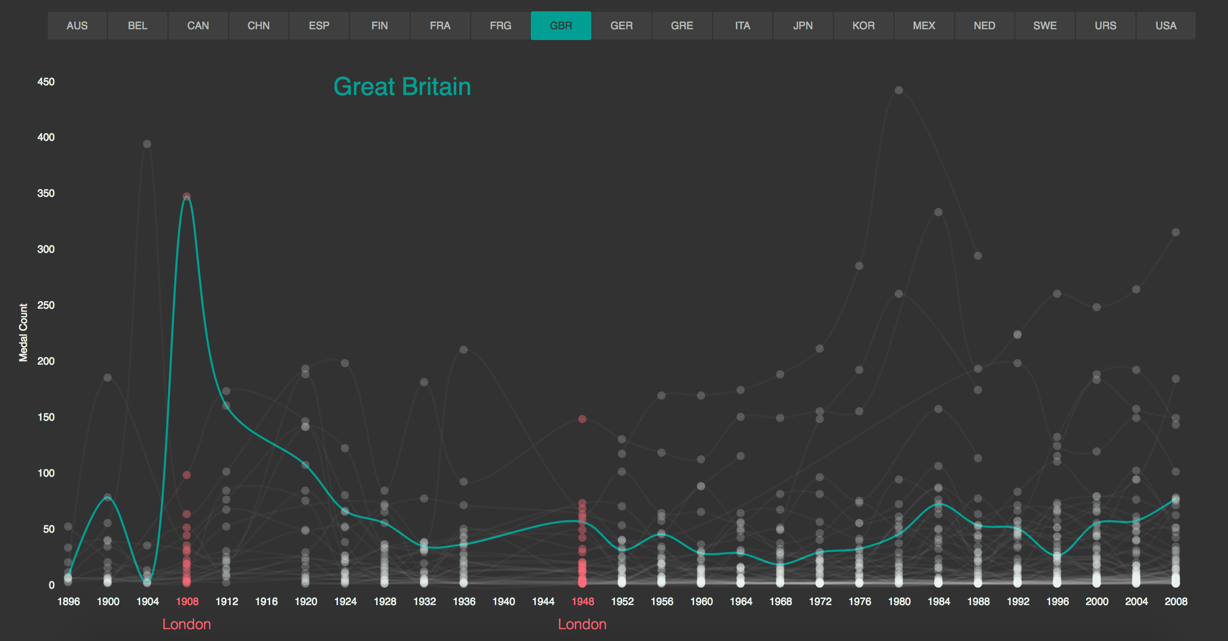 For the final project of my Visual Technologies graduate course, I visualized the performance of host countries in the Summer Olympics throughout time. The Olympics dataset was provided in class and incorporated a wide variety of variables. I decided to tell the story of host countries because it is said that they perform better when they host. The project used D3.js and enables user interaction with the use of buttons to highlight countries and a tool-tip revealed when points are hovered over.